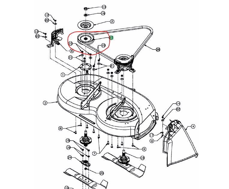 MTD 756-0486 81 cm zespół tnący D, 91 cm zespół tnący B & E, 96 cm zespół tnący F + 107 cm zespół tnący G wyrzut boczny do traktorków trawnikowych seria 400 & 600 Rama skrzynki